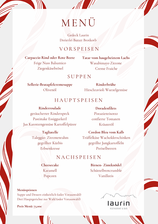 Weihnachtsmenü 2026 Weihnachten 2026 – Unsere Menüempfehlung Download Menü (PDF) Menüpreis 75 € Reservierung: kontakt@restaurant-laurin.de oder Tel. 089/21994870